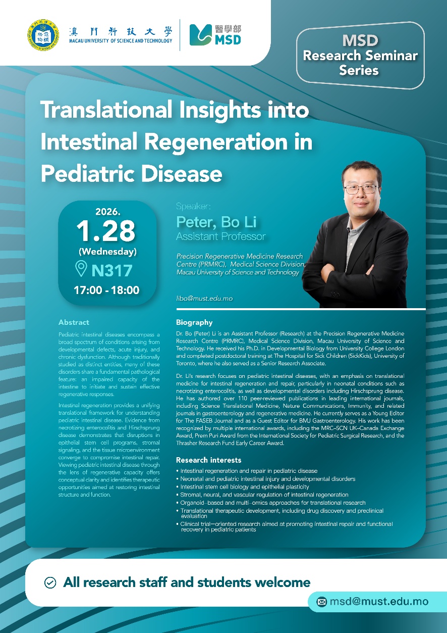 Dr. Bo (Peter) Li is an Assistant Professor (Research) at the Precision Regenerative Medicine Research Centre (PRMRC), Medical Science Division, Macau University of Science and Technology. He received his Ph.D. in Developmental Biology from University College London and completed postdoctoral training at The Hospital for Sick Children (SickKids), University of Toronto, where he also served as a Senior Research Associate.