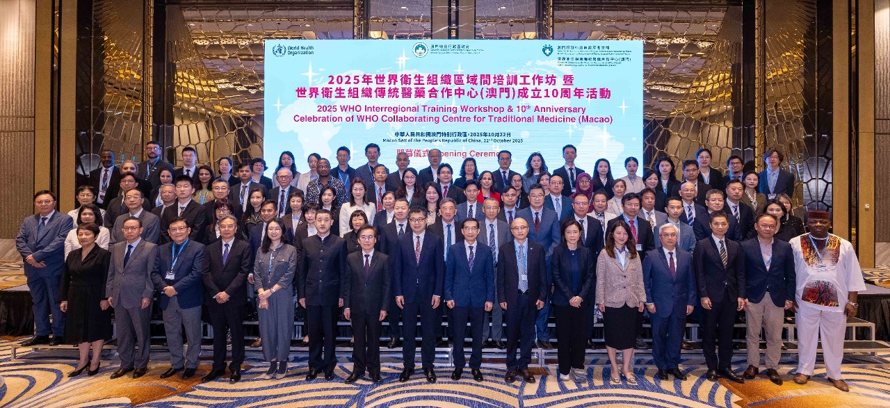由世界卫生组织(世卫)主办、澳门特别行政区政府承办的「2025年世界卫生组织区域间培训工作坊暨世卫传统医药合作中心(澳门)成立10周年活动」于2025年10月22-24日在本澳举行。澳科大副校长姜志宏、中医药学院副院长吴其标、中药机制与质量全国重点实验室教授李婷作为世卫传统医药合作中心(澳门)专家组成员应邀出席。澳门特别行政区政府与世卫亦于10月25日共同主办「本地培训工作坊」,澳科大中医药学院150名同学积极参与培训交流,收获满满。