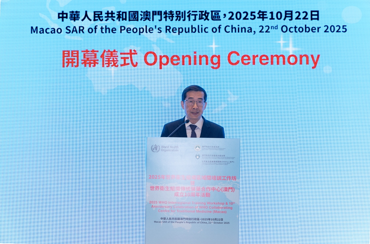 金承哲处长致辞时首先代表世卫感谢澳门特别行政区政府大力支持以及长期保持着友好的合作关系,并回顾了自2011年开启的合作历程,尤其世卫传统医药合作中心(澳门)成立10年以来所取得的丰硕成果,例如共同组织了16期区域间培训工作坊及16期本地培训工作坊,惠及全球逾3100名专业人士,显著提升了各国在传统医学领域的监管、质量及临床实践能力,该中心已发展成为连接世卫与全球在传统医学培训的重要桥梁。而是次开幕仪式后举行的工作坊正值《世卫全球传统医学战略2025–2034》发布之际,将聚焦分享各国传统医学的经验,尤其传统、补充和整合医学产品的质量与安全,对于落实下一个10年发展规划具重要意义。
