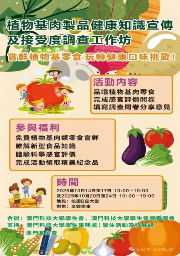 2025年10月14日至24日,由澳門科技大學學生會與營養學會共同主辦的「植物基肉製品體驗工作坊」在澳門科技大學B座大堂成功舉行,活動吸引了大量師生駐足參與,氣氛熱烈。