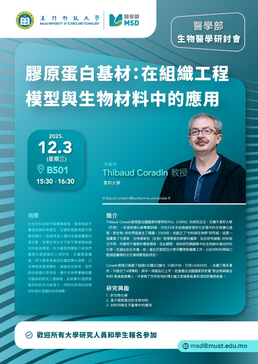 主題:醫學部生物醫學研討會系列- “Collagen-based materials: from tissue models to biomaterials 膠原蛋白基材:在組織工程模型與生物材料中的應用”