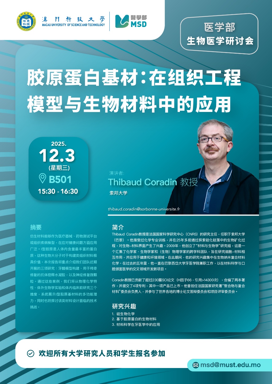 主题:医学部生物医学研讨会系列- “Collagen-based materials: from tissue models to biomaterials 胶原蛋白基材:在组织工程模型与生物材料中的应用”