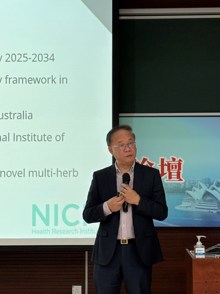 在主題演講中,張旭東教授以“促進補充醫學於高負擔慢性病防治之科學證據基礎——澳洲視角”為題,梳理TCIM的全球格局,並解讀WHO《傳統醫學戰略2025–2034》。張教授結合澳洲實踐,介紹當地補充醫學的應用現狀與監管框架,以及中醫藥教育與註冊模式,強調高質量臨床證據與嚴謹制度對保障醫療安全的重要性。隨後,他概述NICM在慢性病防治領域的主要研究方向,並以創新複方製劑“塞絡通”用於血管性癡呆為案例,分享從藥理機制、臨床評價到產品轉化的研發進展,展現補充醫學在高負擔慢性病管理中的廣闊前景。在演講後的交流環節中,張教授與師生就澳洲中醫藥發展現狀、醫保覆蓋等問題展開深入討論。與會師生表示,此次講座內容豐富、視野開闊,尤其是對大家瞭解澳洲中醫藥發展情況,更好地發展和傳播中醫藥具有重要啟示作用。