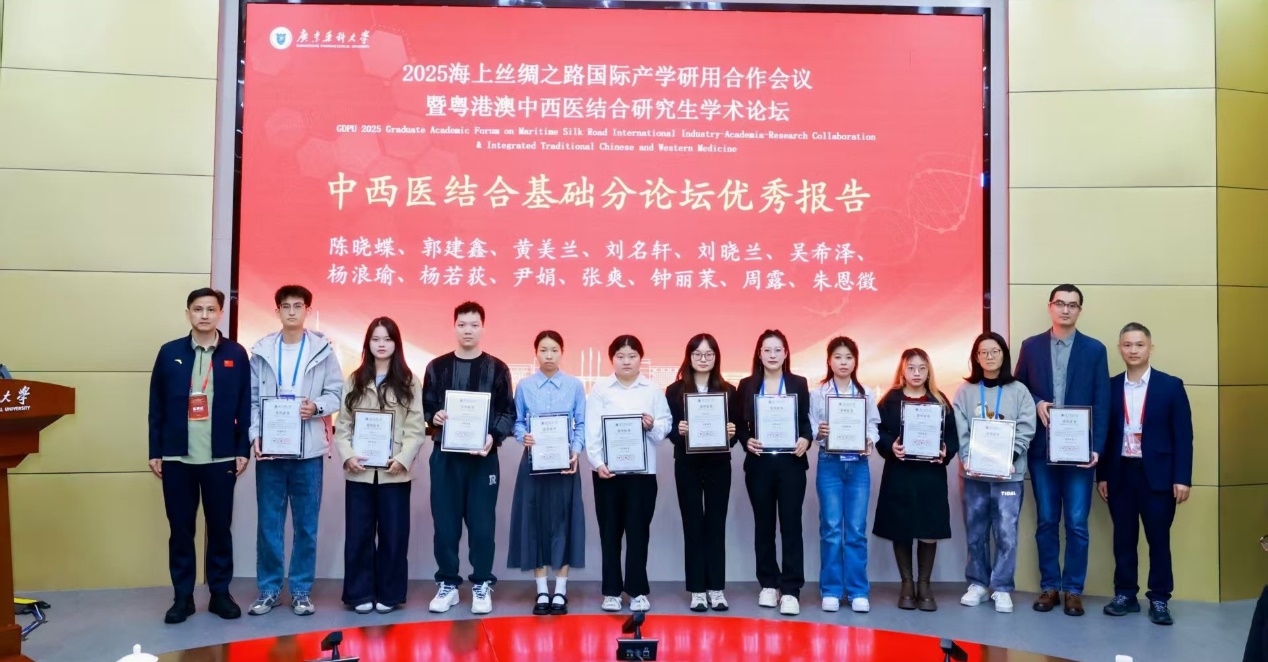 2025年11月27日至29日,由广东省教育厅、广东药科大学主办,中医药研究所(广东省代谢病中西医结合研究中心)、广东药科大学附属第一医院承办的「2025海上丝绸之路国际产学研用合作会议暨粤港澳中西医结合研究生学术论坛」在广州举办。澳科大中医药学院学生积极参与,于丽丽副教授应邀出席并作主旨报告,博士后研究员刘名轩和博士生杨浪瑜作专题汇报并荣获优秀学术报告奖。