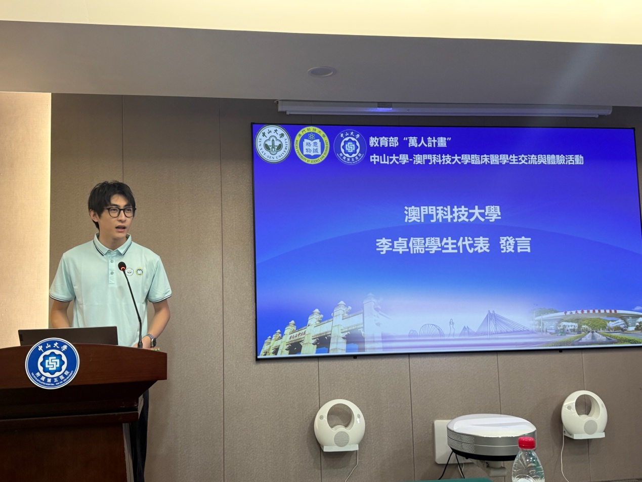 最后,由澳门科技大学医学院助理院长韩守裕副教授代表医学院致辞。首先,韩副教授向中山大学附属第五医院表达最诚挚的感谢,感谢他们一直以来对澳门科技大学医学院的支持与付出。他指出,医学院能够安排五年级和六年级医学生到中大五院进行临床培训,对学院整体医学课程的发展发挥了关键而深远的作用。其后,韩副教授勉励在场学生珍惜此次宝贵的经验,鼓励他们善用此次机会向经验丰富的临床医生学习,了解不同的医疗体系,提升自身的临床推理能力、职业素养和团队合作能力。希望学生们能以求知的态度、谦逊的精神和追求卓越的决心来对待这次交流项目。