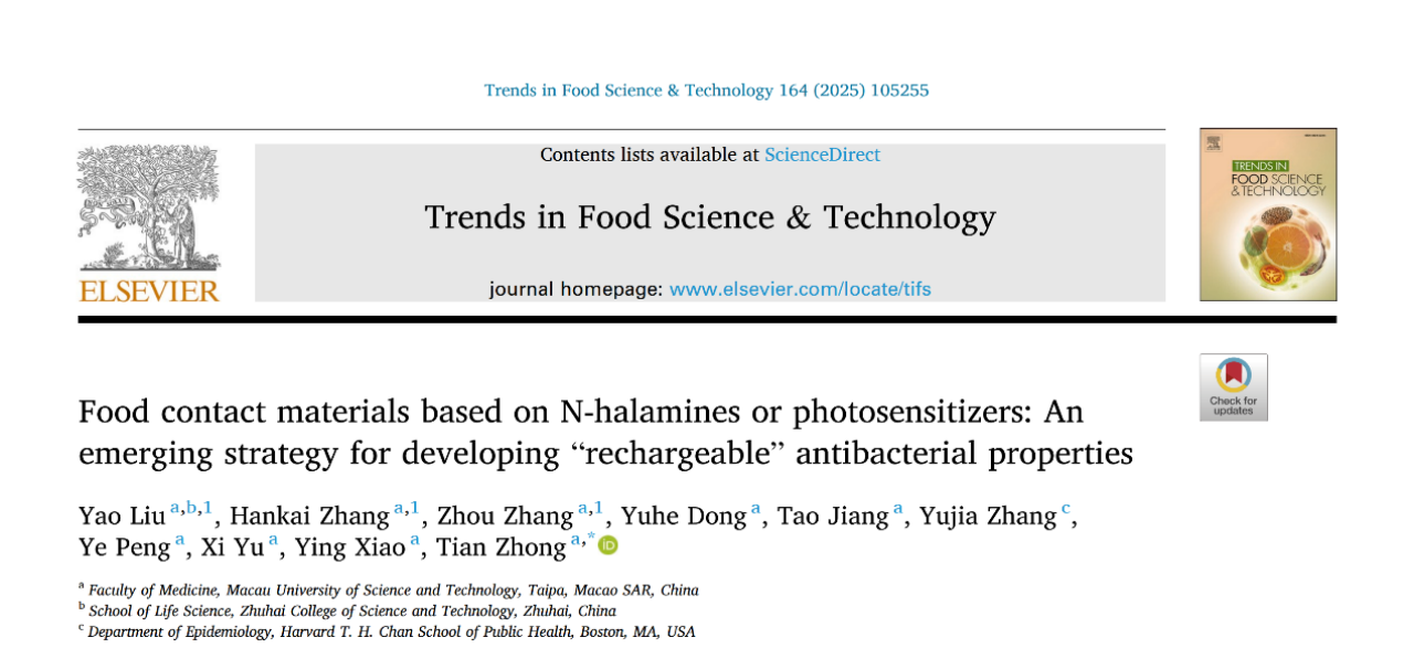 The paper is titled “Food contact materials based on N-halamines or photosensitizers: An emerging strategy for developing ‘rechargeable’ antibacterial properties”. The Faculty of Medicine at MUST is the first affiliation for this paper, and Associate Professor Tian Zhong served as the corresponding author. This research was funded by the Macao Science and Technology Development Fund (Grant Nos. 0005/2024/AGJ and 0009/2023/AFJ).
