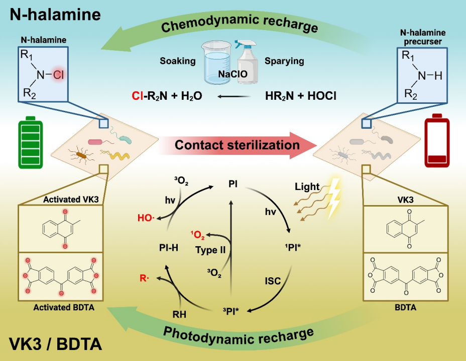 Schematic diagram of the "charge-discharge" cycle for the antibacterial activity of N-halamines and photosensitizers.